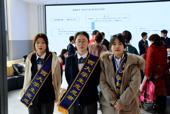 参加迎新的老师们在综合楼大厅设立了问询处、注册处、缴费处,程序畅通,有条不紊,努力让新生报到更加便捷、温暖。学生志愿者佩戴着欢迎新生的绶带,带领新同学从查询分班情况、办理缴费、领取公寓用品、领取饭卡到布置宿舍,为他们搭建了一条快速入学通道。“同学你好,欢迎来到西大,请往这边走!”“我来帮拿行李吧!”……一遍遍、一趟趟,志愿者们在乍暖还寒的早春天气里,用热情与耐心为新生及家长们提供帮助。周到的引领、细心的介绍、亲切的问候,让新同学和家长感受到西大校园的温暖情意。